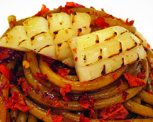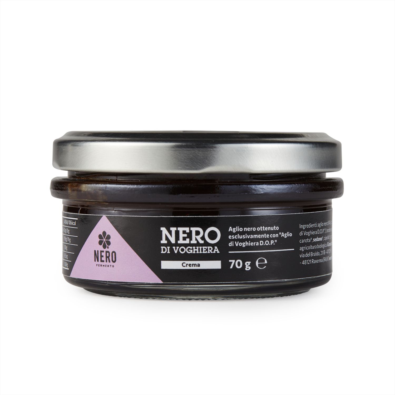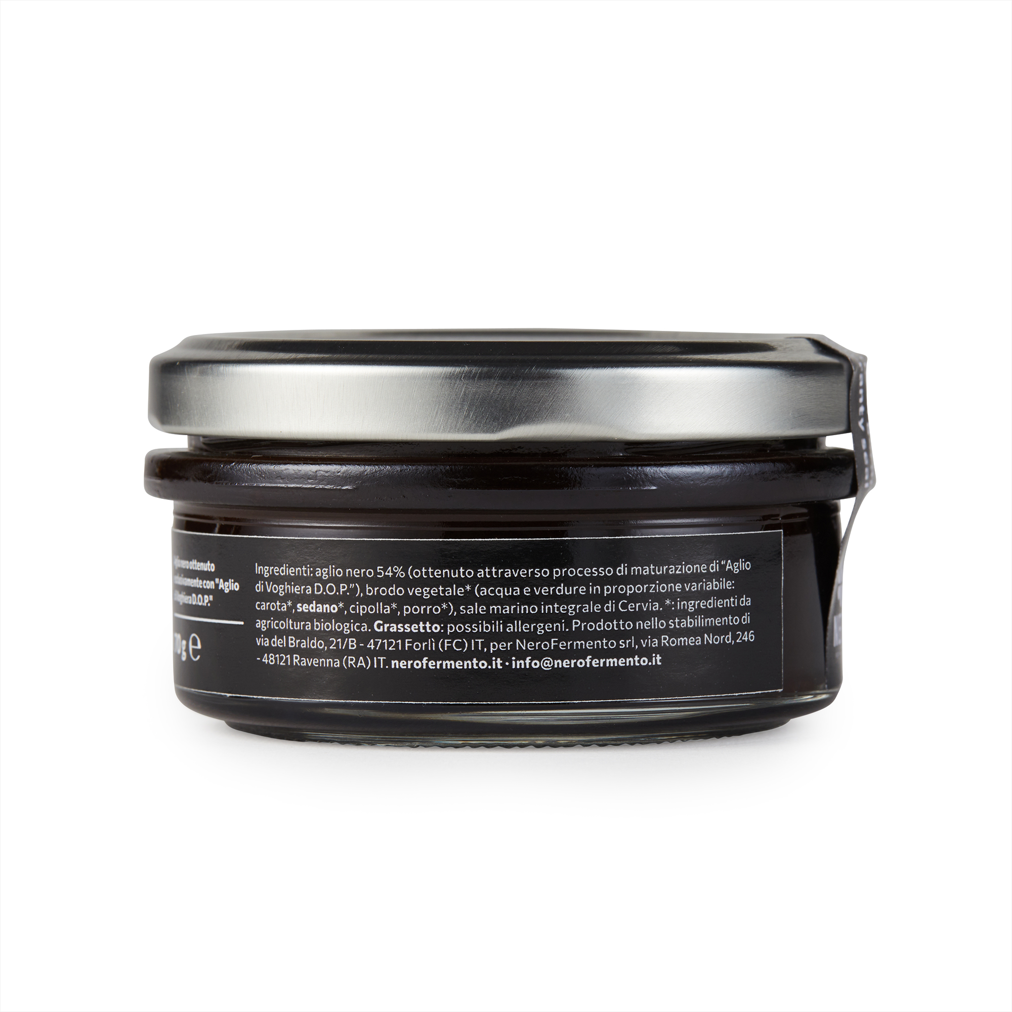 Schwarze Knoblauchcreme, die durch den Reifungsprozess von "Aglio di Voghiera D.O.P." gewonnen wird.