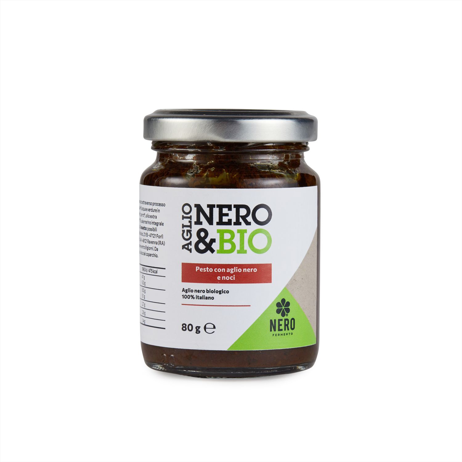 Pesto mit Walnüssen, Basilikum und schwarzem Knoblauch, der durch den Reifungsprozess von Bio-Knoblauch gewonnen wird.