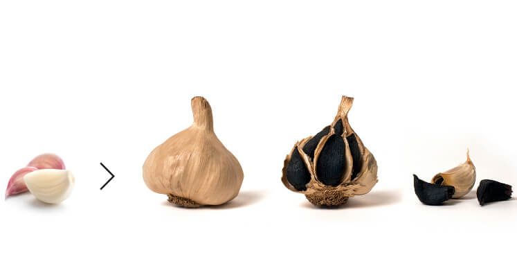 L'schwarzer Knoblauch erhält man durch einen Prozess der natürliche Gärungbei dem der frische Knoblauch einer kontrollierten Temperatur ausgesetzt wird (60-90°C) und hohe Luftfeuchtigkeit (70-90%) für einen Zeitraum, der zwischen 15 und 90 Tage.