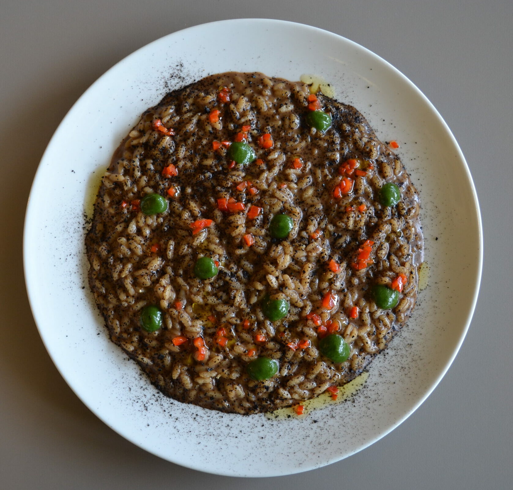 Impiety: Arrange the risotto on soup plates. Garnish with drops or spirals of parsley sauce, fresh red pepper flakes and a sprinkling of black garlic powder. Complete with a drizzle of raw extra virgin olive oil for a final touch of roundness.