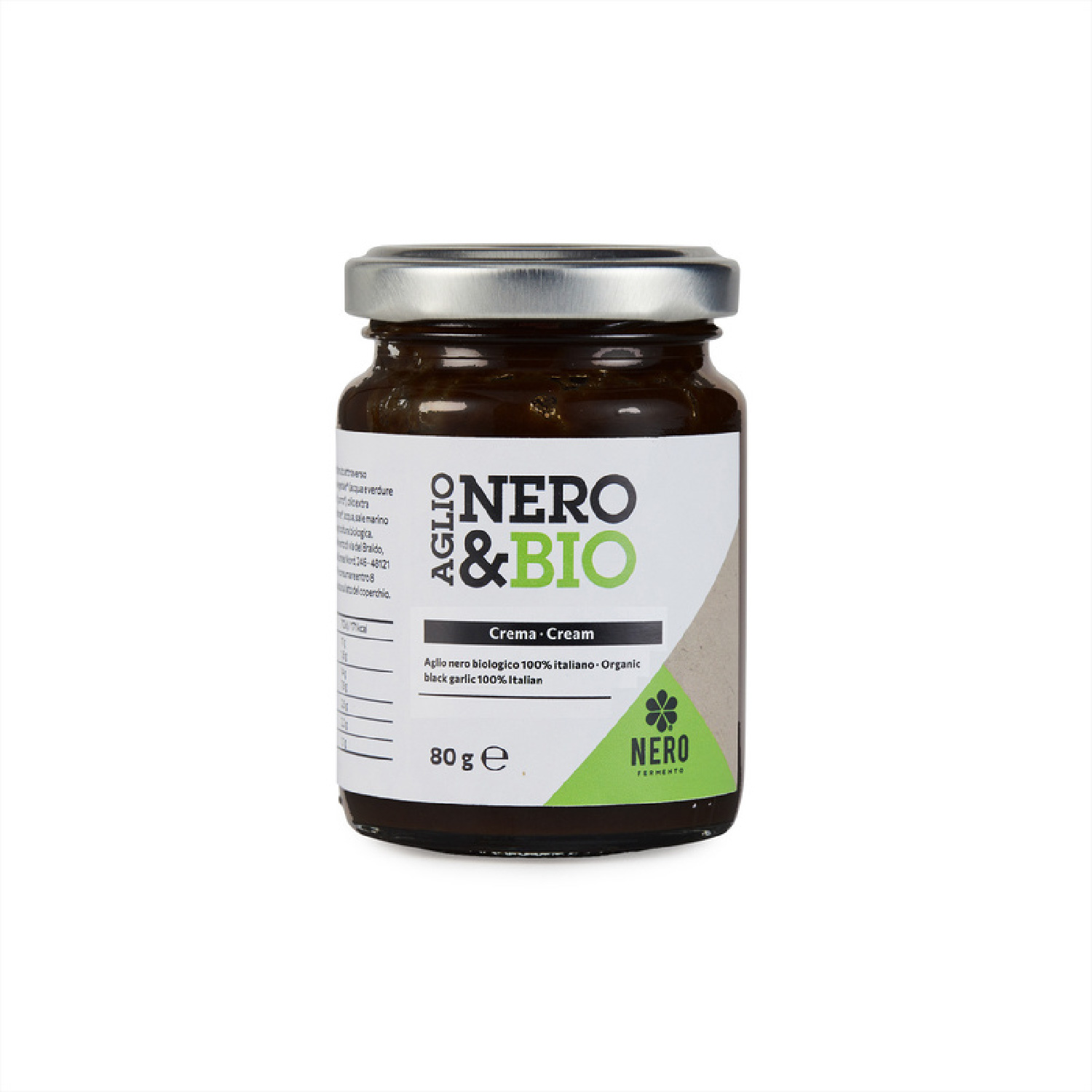 Crème d'ail noir obtenue par le processus de maturation de l'ail italien biologique 100%.