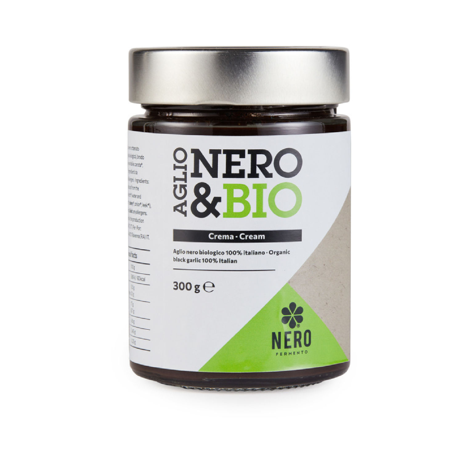 Crema di aglio nero ottenuto attraverso processo di maturazione di aglio biologico 100% italiano.